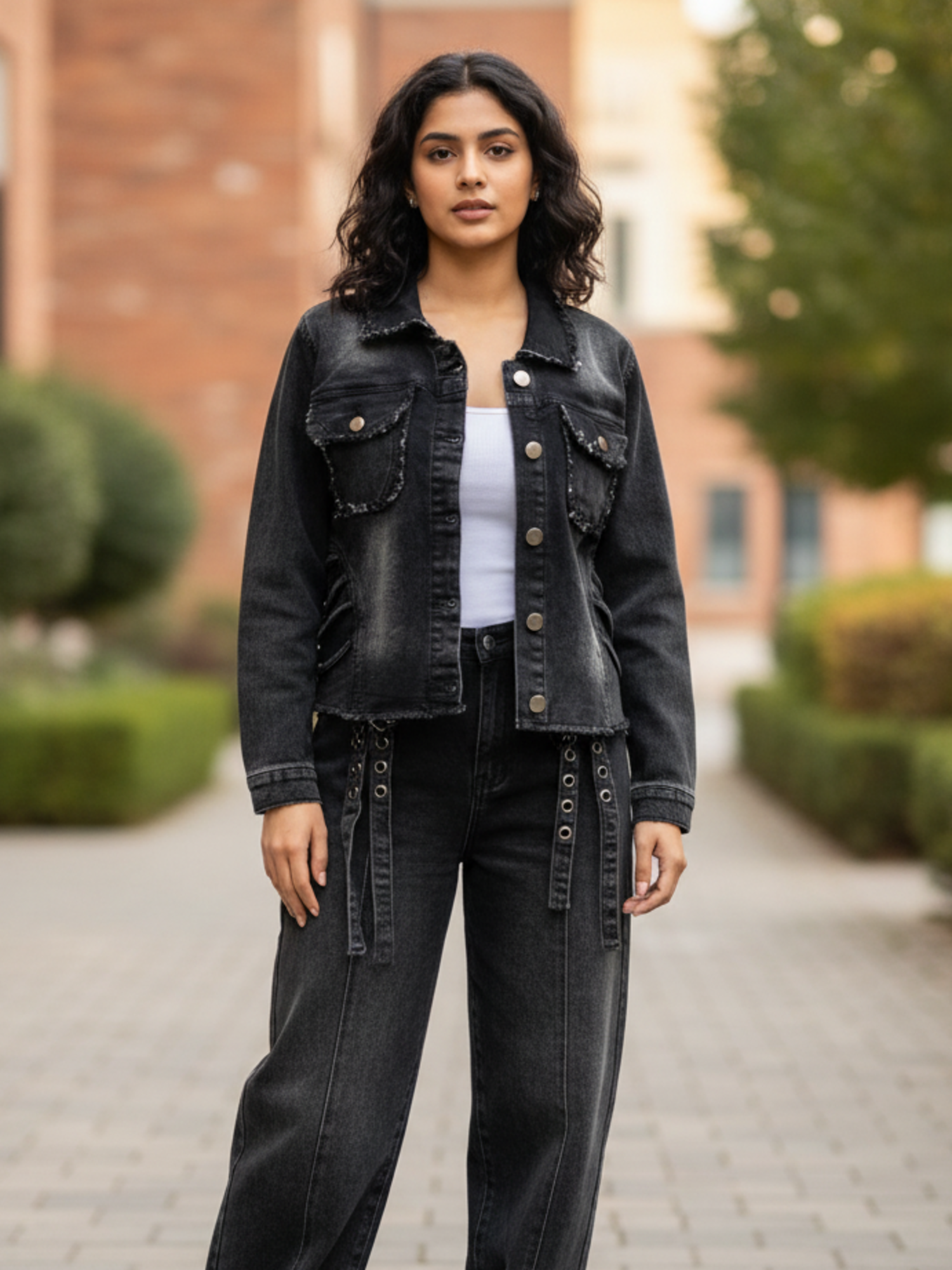 A black denim jacket with frayed chest pockets, silver buttons, and eyelet detailing—where classic grit meets contemporary edge.
